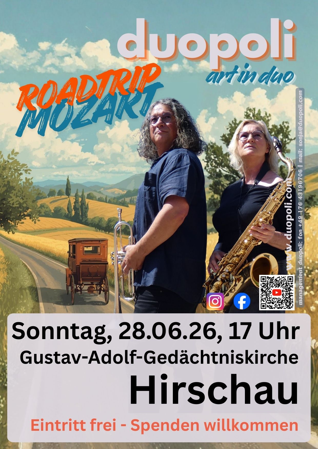 28. Juni 2026, 17.00 UhrGustav-Adolf-Gedächtniskirche, 92242 HirschauRoadTrip MOZART
